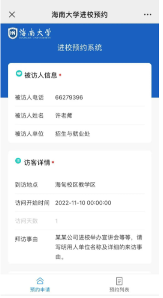 被访人信息请按照下方的图片进行填写,来访事由请写明具体的事项内容或进校原因,如因描述不清导致审核不通过请各用人单位自行负责: